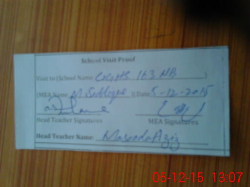 | School Visited by School Health & Nutrition Supervisor (No. of Visits) | 1 | Name1: | KHAWAR HAYAT SHAH | Name2: | |