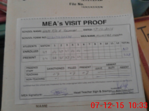 | Attendance Register | Head Teacher | MEA with School | Visit Proof |
