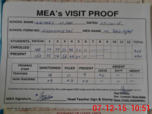 | Certified that this School was Inspected by the Undersigned MEA/DMO Today and the Information Stated Above is as Per Record. | |||||