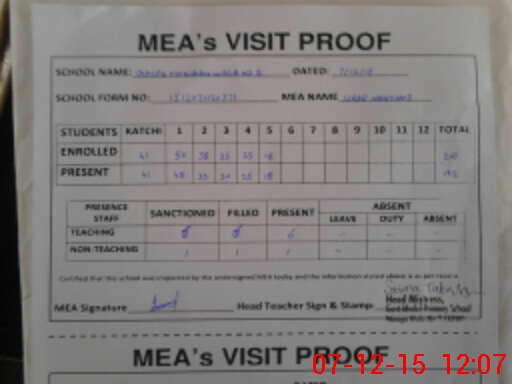 | Attendance Register | Head Teacher | MEA with School | Visit Proof |