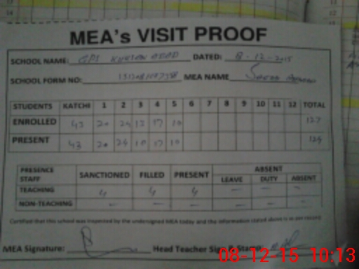 | Attendance Register | Head Teacher | MEA with School | Visit Proof |
