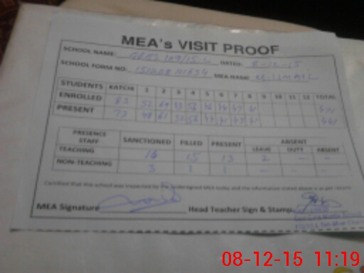 | Attendance Register | Head Teacher | MEA with School | Visit Proof |