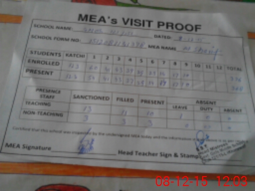 | Attendance Register | Head Teacher | MEA with School | Visit Proof |