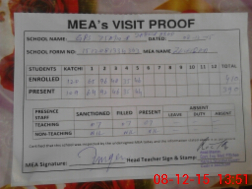 | Attendance Register | Head Teacher | MEA with School | Visit Proof |