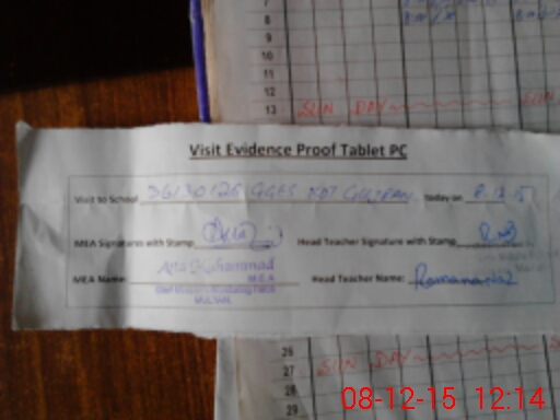 | Attendance Register | Head Teacher | MEA with School | Visit Proof |