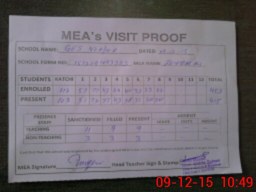 | Attendance Register | Head Teacher | MEA with School | Visit Proof |