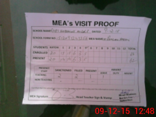| Attendance Register | Head Teacher | MEA with School | Visit Proof |