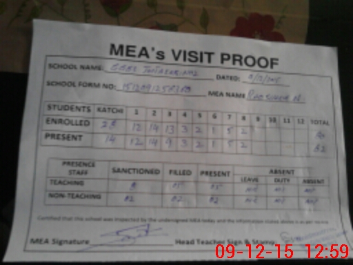 | Attendance Register | Head Teacher | MEA with School | Visit Proof |