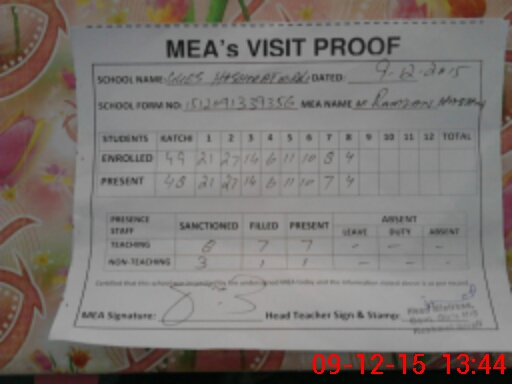 | Attendance Register | Head Teacher | MEA with School | Visit Proof |