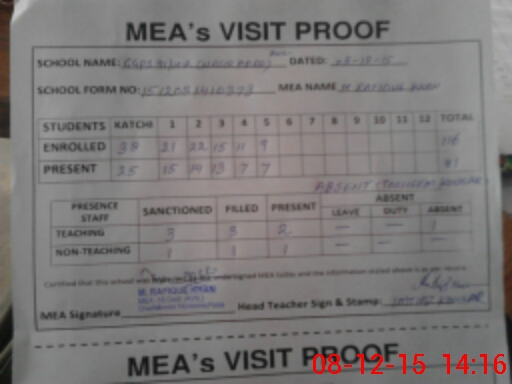 | Attendance Register | Head Teacher | MEA with School | Visit Proof |