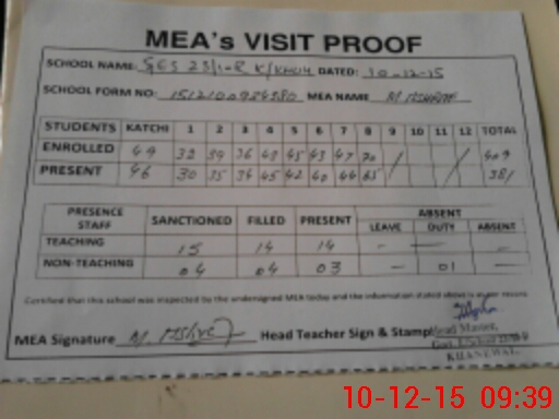 | Certified that this School was Inspected by the Undersigned MEA/DMO Today and the Information Stated Above is as Per Record. | |||||
