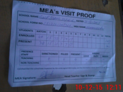 | Attendance Register | Head Teacher | MEA with School | Visit Proof |