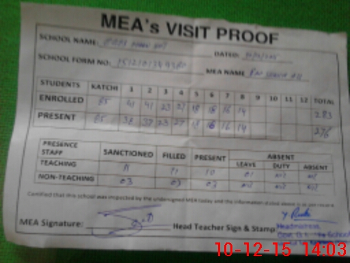 | Attendance Register | Head Teacher | MEA with School | Visit Proof |