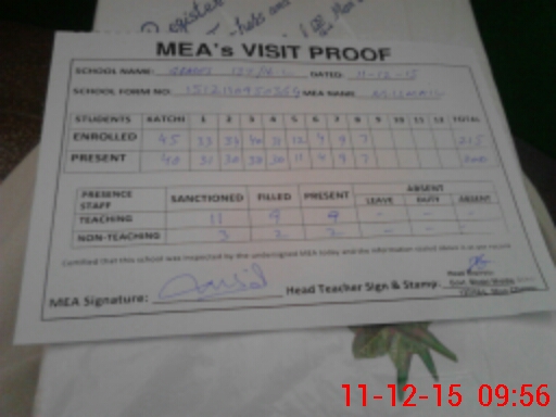 | Attendance Register | Head Teacher | MEA with School | Visit Proof |