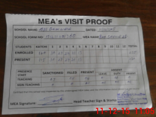 | Attendance Register | Head Teacher | MEA with School | Visit Proof |