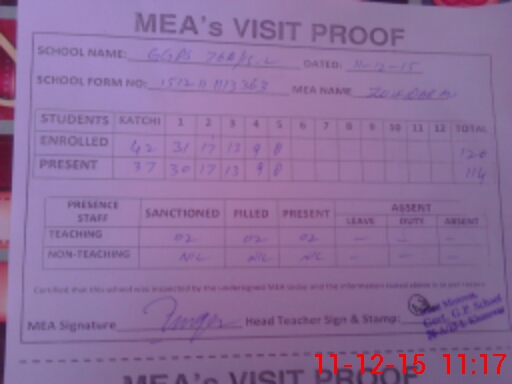 | Attendance Register | Head Teacher | MEA with School | Visit Proof |