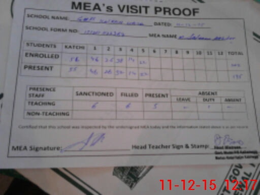 | Attendance Register | Head Teacher | MEA with School | Visit Proof |