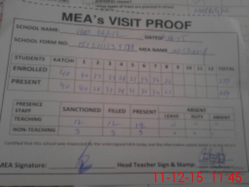 | Attendance Register | Head Teacher | MEA with School | Visit Proof |