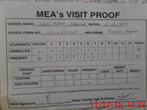 | Attendance Register | Head Teacher | MEA with School | Visit Proof |