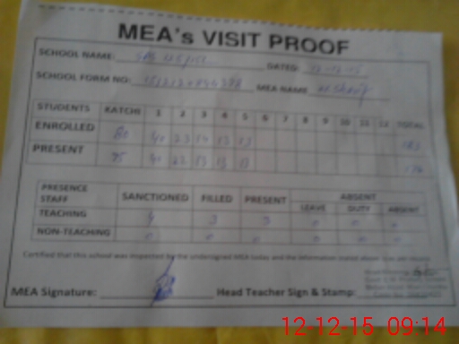 | Attendance Register | Head Teacher | MEA with School | Visit Proof |