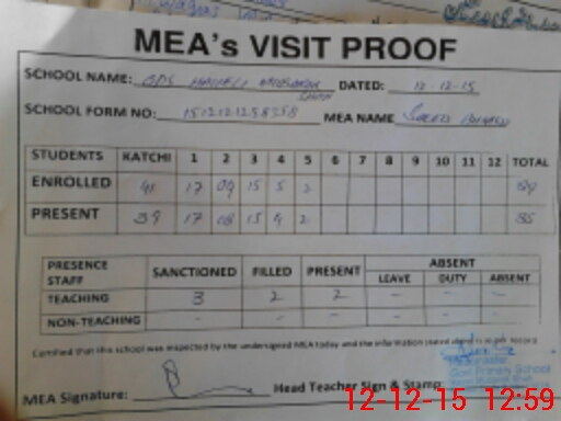 | Attendance Register | Head Teacher | MEA with School | Visit Proof |