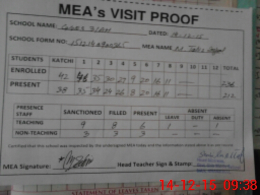 | Attendance Register | Head Teacher | MEA with School | Visit Proof |