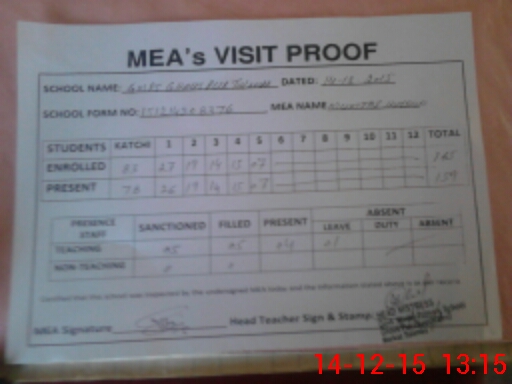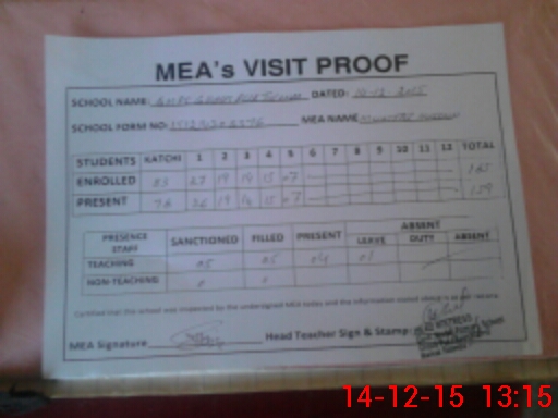 | Attendance Register | Head Teacher | MEA with School | Visit Proof |
