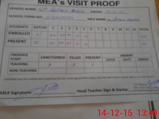 | Attendance Register | Head Teacher | MEA with School | Visit Proof |