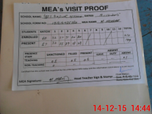 | Attendance Register | Head Teacher | MEA with School | Visit Proof |
