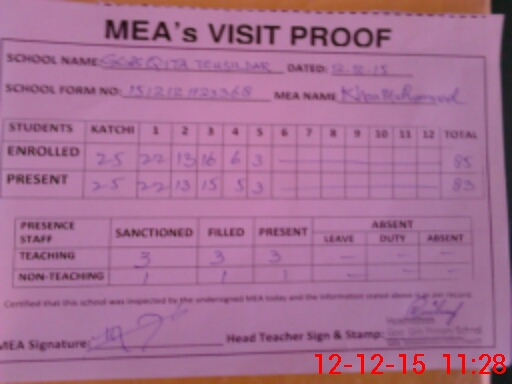 | Attendance Register | Head Teacher | MEA with School | Visit Proof |