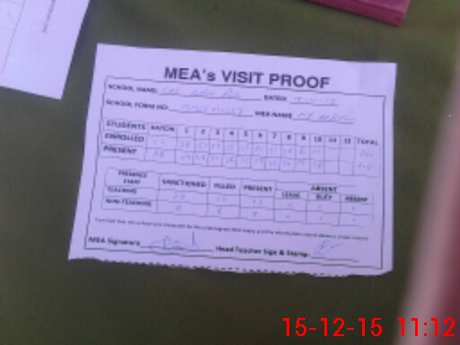 | Attendance Register | Head Teacher | MEA with School | Visit Proof |