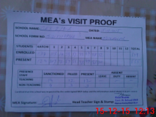 | Attendance Register | Head Teacher | MEA with School | Visit Proof |