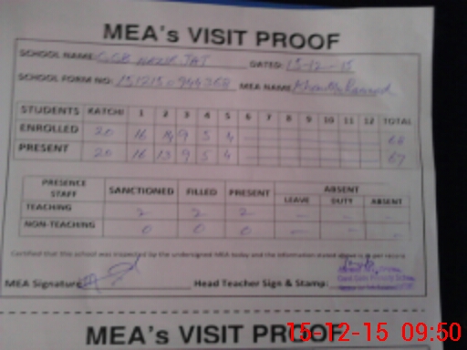 | Attendance Register | Head Teacher | MEA with School | Visit Proof |