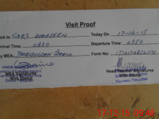 | Attendance Register | Head Teacher | MEA with School | Visit Proof |