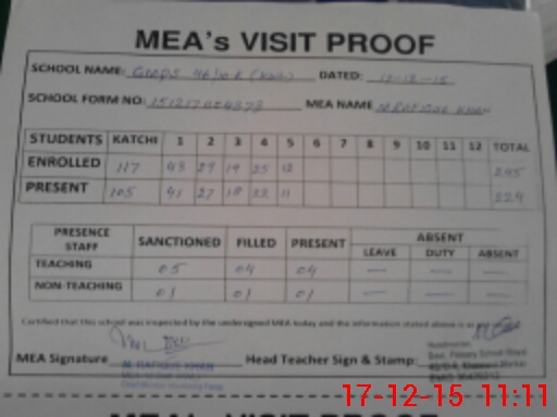 | Attendance Register | Head Teacher | MEA with School | Visit Proof |