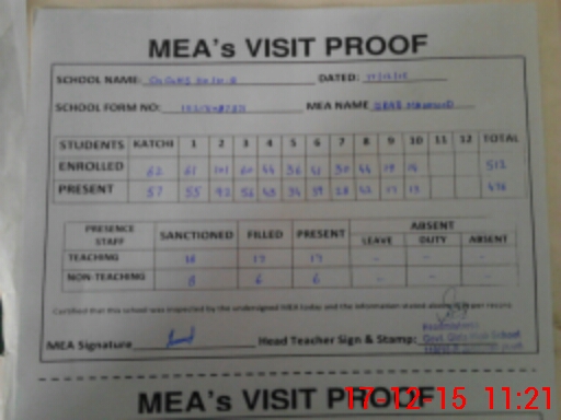 | Attendance Register | Head Teacher | MEA with School | Visit Proof |