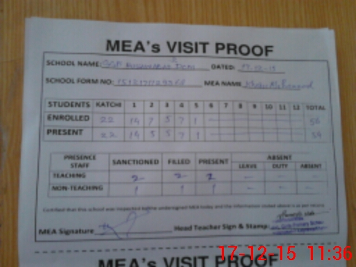 | Attendance Register | Head Teacher | MEA with School | Visit Proof |