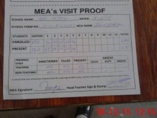 | Attendance Register | Head Teacher | MEA with School | Visit Proof |