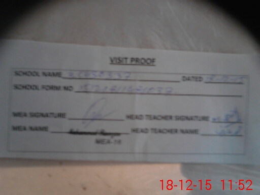 | Remarks (Use Separate Page if Required): I had visited this school on 14 nov 2015 school head show me someone other leady teacher and Today head teacher showing me someoe another leady heaving nothing for identyfication as Teacher Hafiza Nayab Gohar ESE so she marked as Absent DTE just entered his visit without any monitoring assessment | |||||
