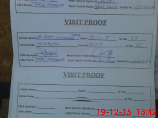 | School Visited by School Health & Nutrition Supervisor (No. of Visits) | 1 | Name1: | SAKHAWAT ALI | Name2: | |