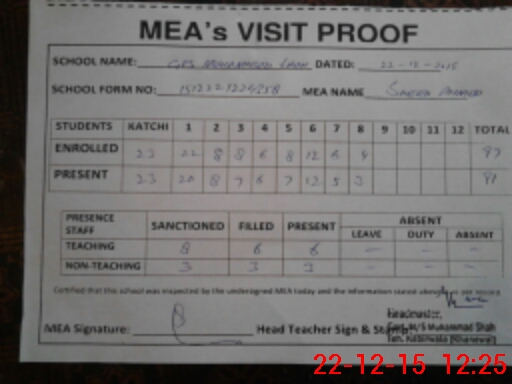 | Attendance Register | Head Teacher | MEA with School | Visit Proof |