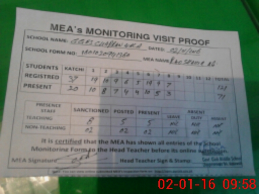| Attendance Register | Head Teacher | MEA with School | Visit Proof |