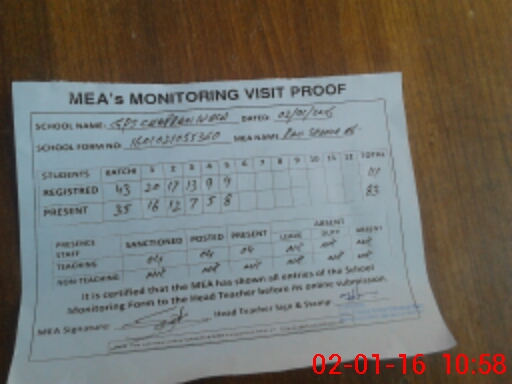 | Attendance Register | Head Teacher | MEA with School | Visit Proof |