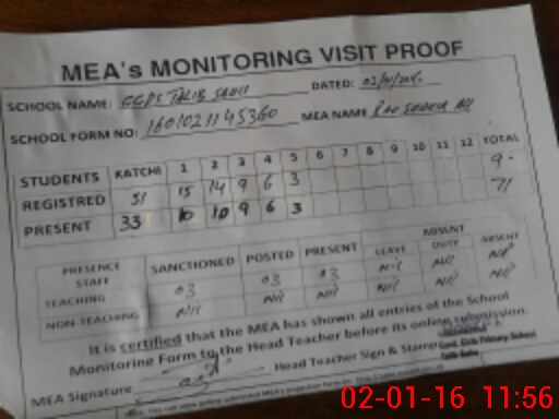 | Attendance Register | Head Teacher | MEA with School | Visit Proof |