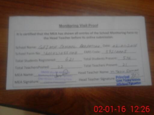 | Attendance Register | Head Teacher | MEA with School | Visit Proof |