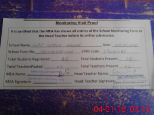 | Attendance Register | Head Teacher | MEA with School | Visit Proof |