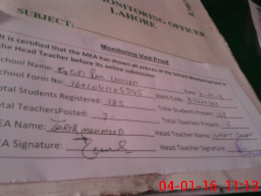 | Name: IS**** JA**** Designation: (School Headmaster's/Headmistress's) Head Mistress Phone/Cell Number: 03**** |