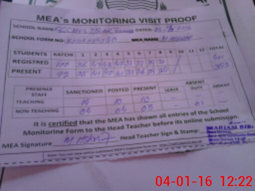 | Attendance Register | Head Teacher | MEA with School | Visit Proof |