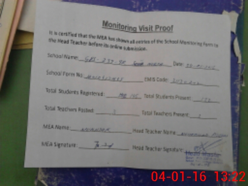 | Attendance Register | Head Teacher | MEA with School | Visit Proof |