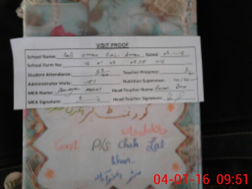 | School Visited by School Health & Nutrition Supervisor (No. of Visits) | Name1: | Javed Maqsood | Name2: | ||